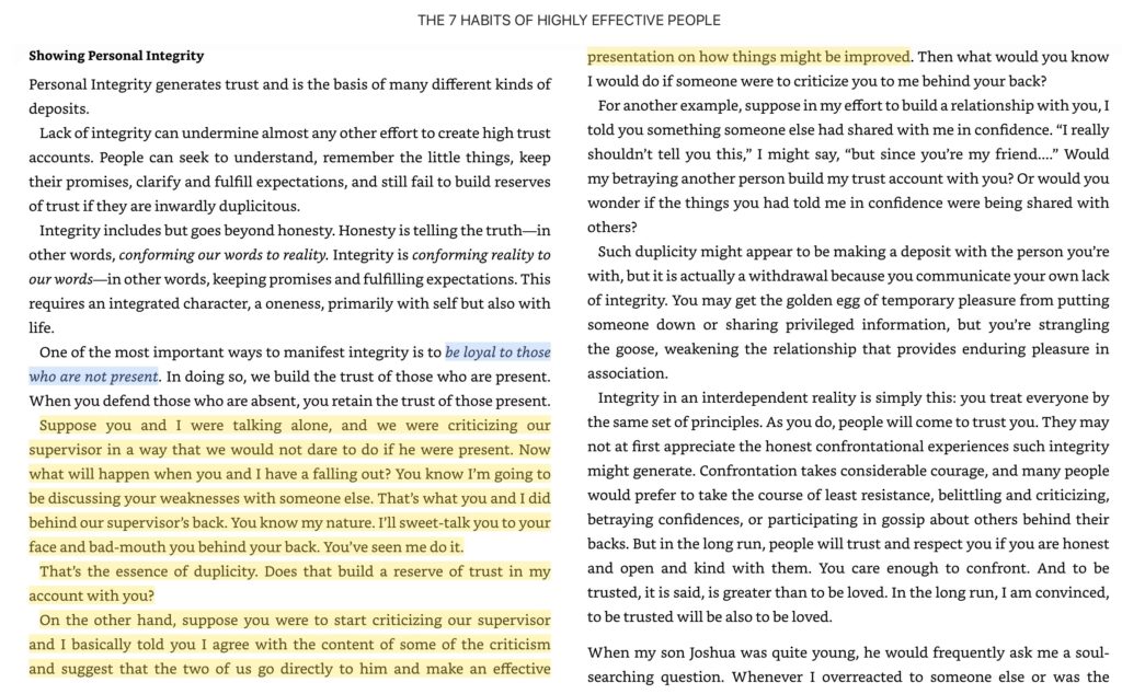 Covey and 7H: ‘On Being Loyal to Those Not Present; Not Criticizing behind others’ backs, How to respond if others do’